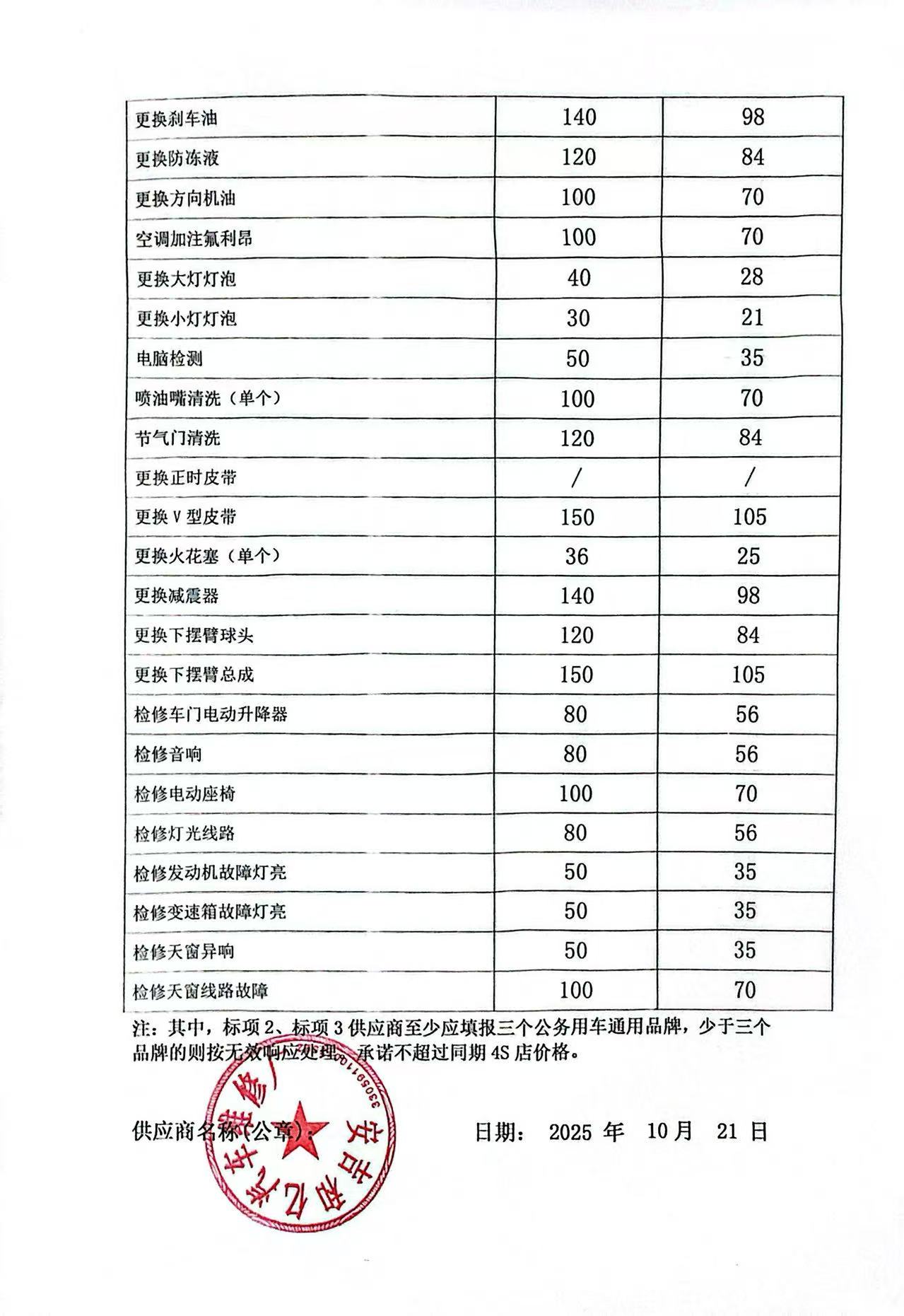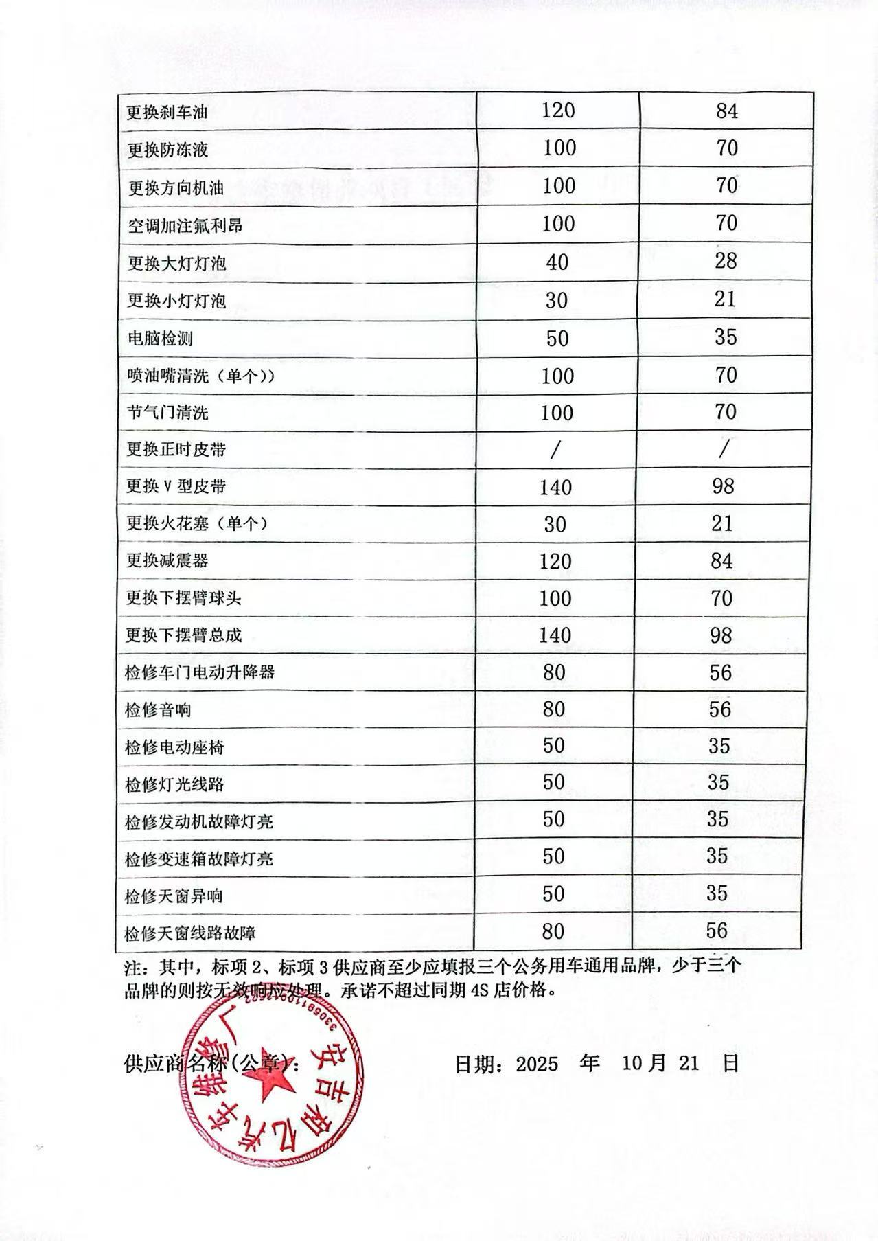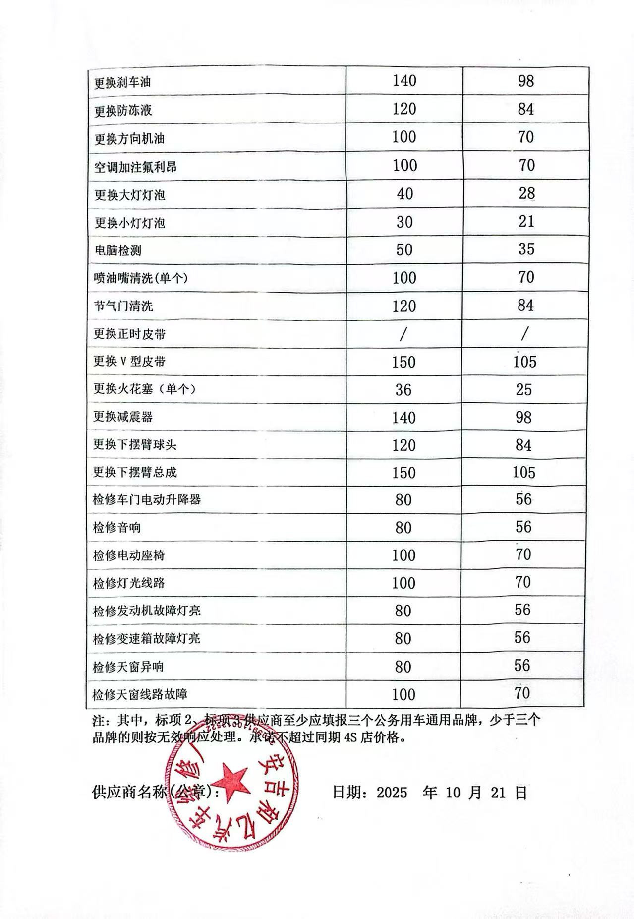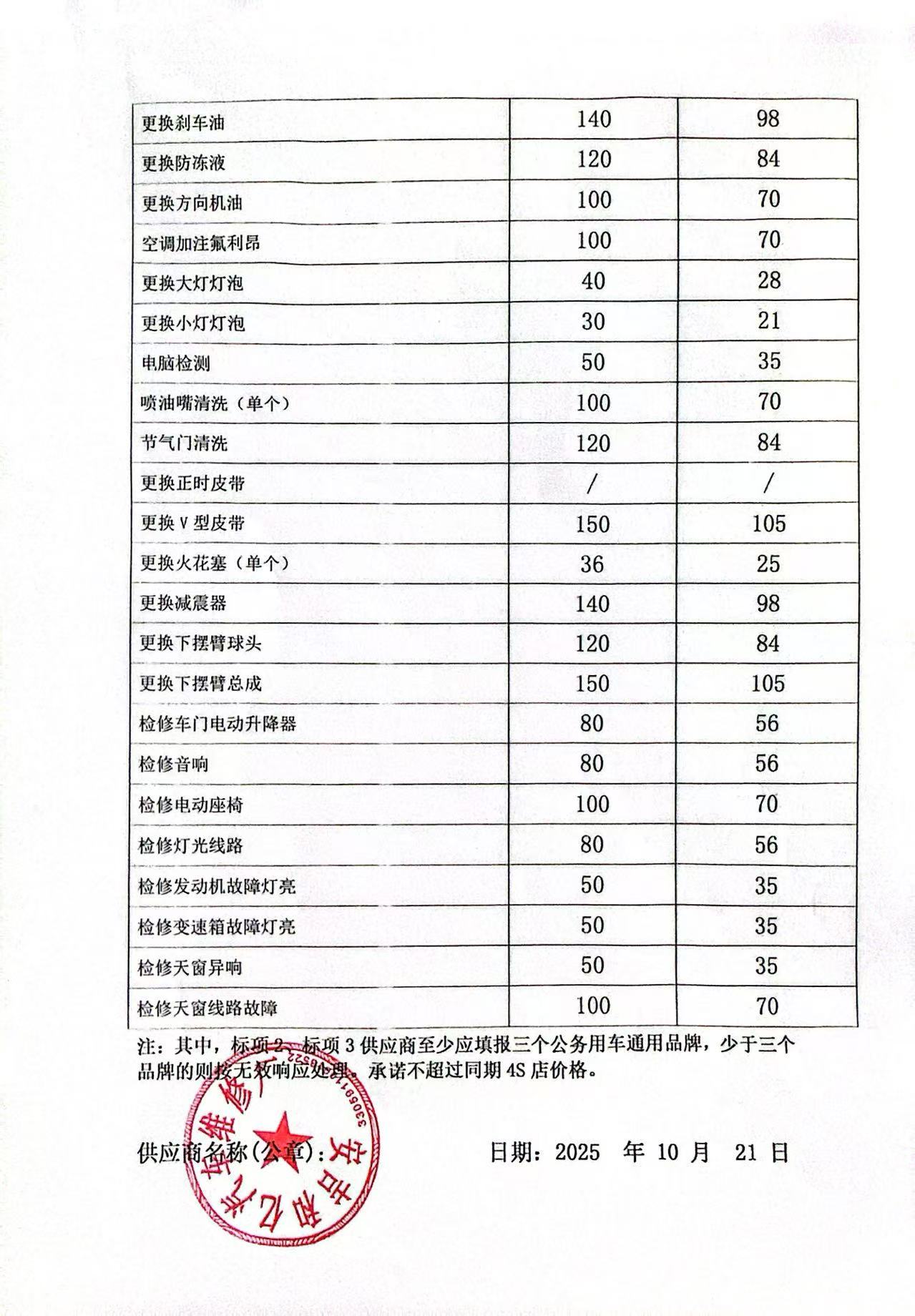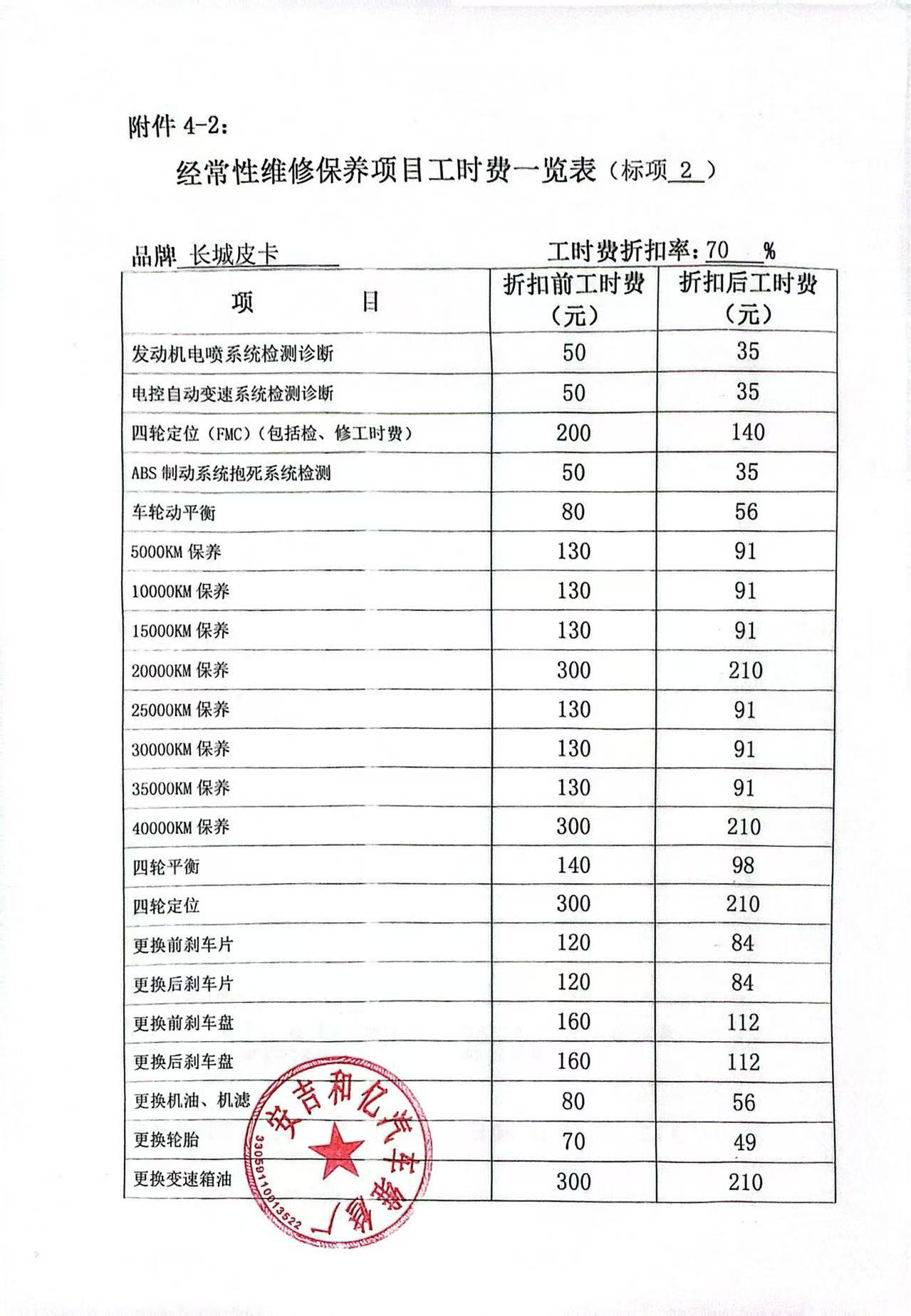 | 一、二类维修供应商(综合修理类) | ****一、二类维修供应商(综合修理类) | 服务方案: 我们的服务流程: 1. 接车诊断:客户到店后30分钟内完成初步检测,出具书面故障报告与报价单。 2. 维修执行:全程可视化(如提供维修进度照片/视频),关键步骤需客户确认后再操作。 3. 质检交付:维修后进行3重质检(技师自检、车间复检、出厂终检),交付时提供维修清单与质保凭证。 服务承诺: 质量保证,交货及时,价格合理,服务周到。 报价一览表:报价一览表.jpg 经常性维修保养项目工时费一览表:经常性维修保养项目工时费一览表1.jpg 经常性维修保养项目工时费一览表2.jpg 经常性维修保养项目工时费一览表3.jpg 经常性维修保养项目工时费一览表4.jpg 经常性维修保养项目工时费一览表5.jpg 经常性维修保养项目工时费一览表6.jpg 经常性维修保养项目工时费一览表7.jpg 经常性维修保养项目工时费一览表8.jpg 经常性维修保养项目零配件材料费:经常性维修保养项目零配件材料费1.jpg 经常性维修保养项目零配件材料费2.jpg 经常性维修保养项目零配件材料费3.jpg 经常性维修保养项目零配件材料费4.jpg 经常性维修保养项目零配件材料费5.jpg 经常性维修保养项目零配件材料费6.jpg 经常性维修保养项目零配件材料费7.jpg 经常性维修保养项目零配件材料费8.jpg | 优惠率 70% |